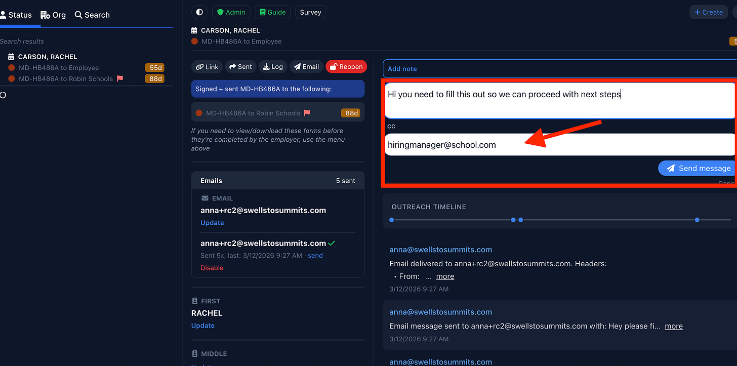 When you send a message from the Robinform dashboard, there may be times when you want to loop in another team mate or stakeholder (i.e. reminding the candidate to fill out their forms, and cc’ing the hiring manager or principal). Here’s how you’d do that from the record in Robinform: