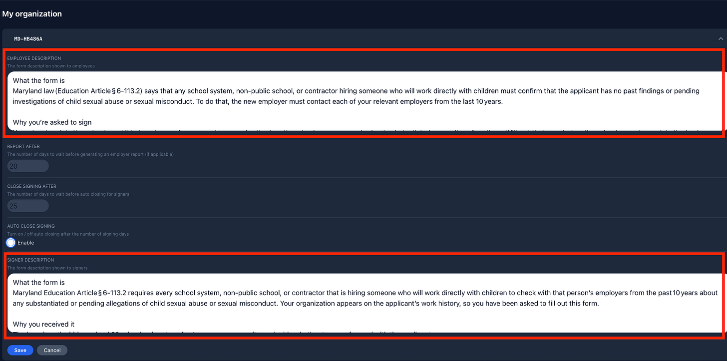 Once selected, you can edit the text in the “Employee Description”, which is what your candidates or employees see. You can also customize the “Signer Description”, which is what signers will see (i.e. past employers). Hit “Save” at the bottom to save the custom changes.