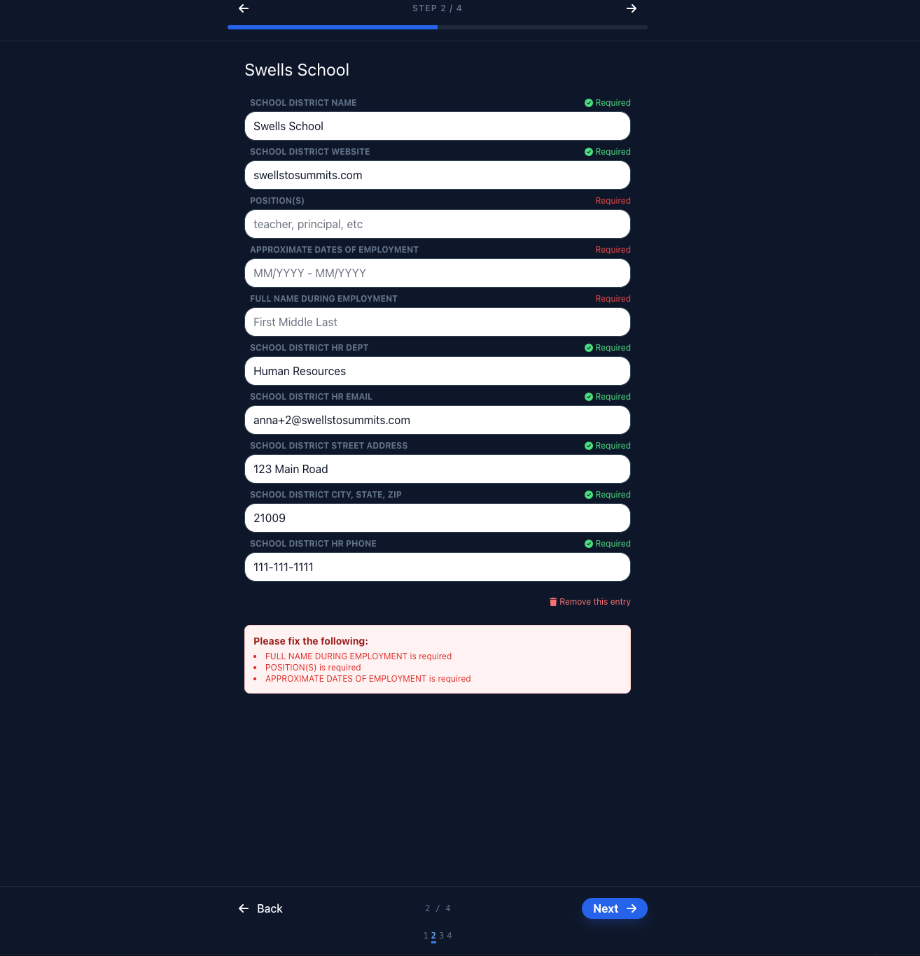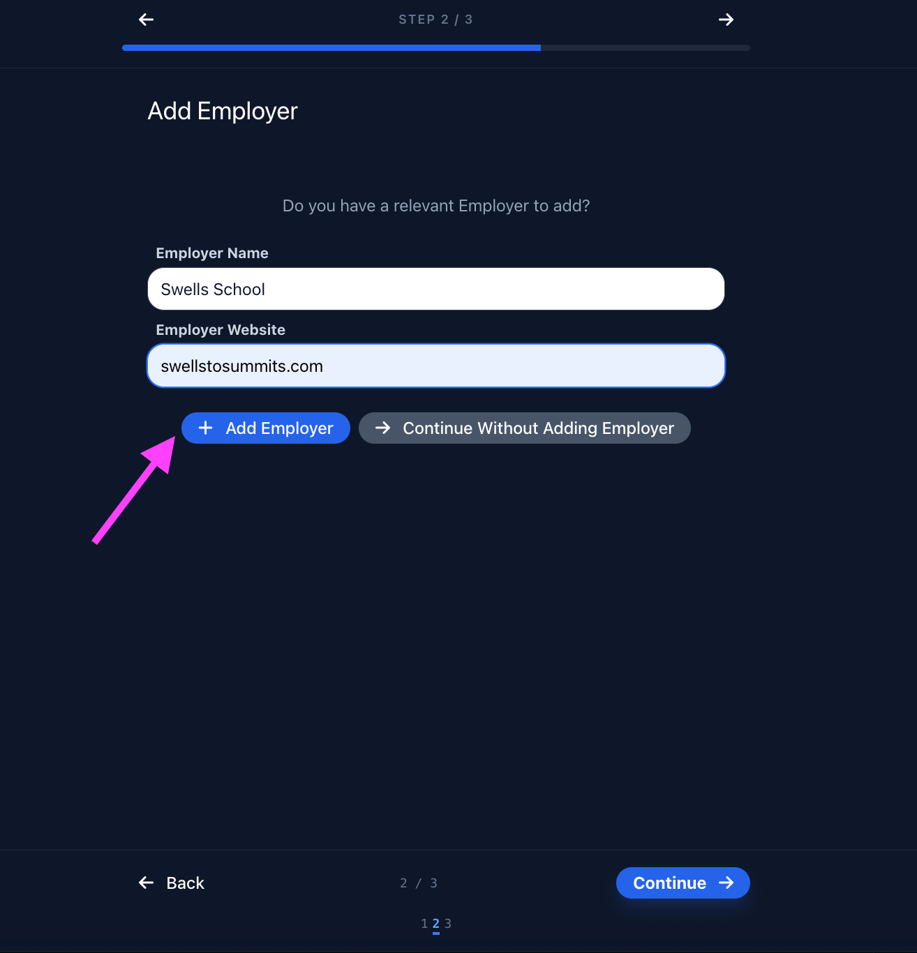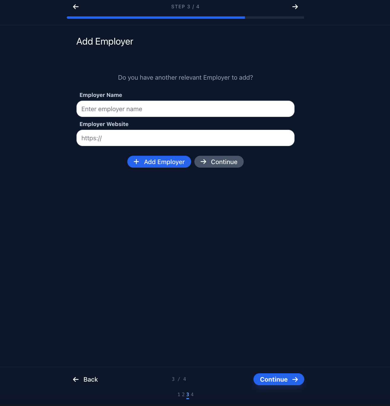 For many forms you will be asked to add past employer information. You can add as many employers as you need to. Enter the name of the employer and their website, then hit “Add Employer”.