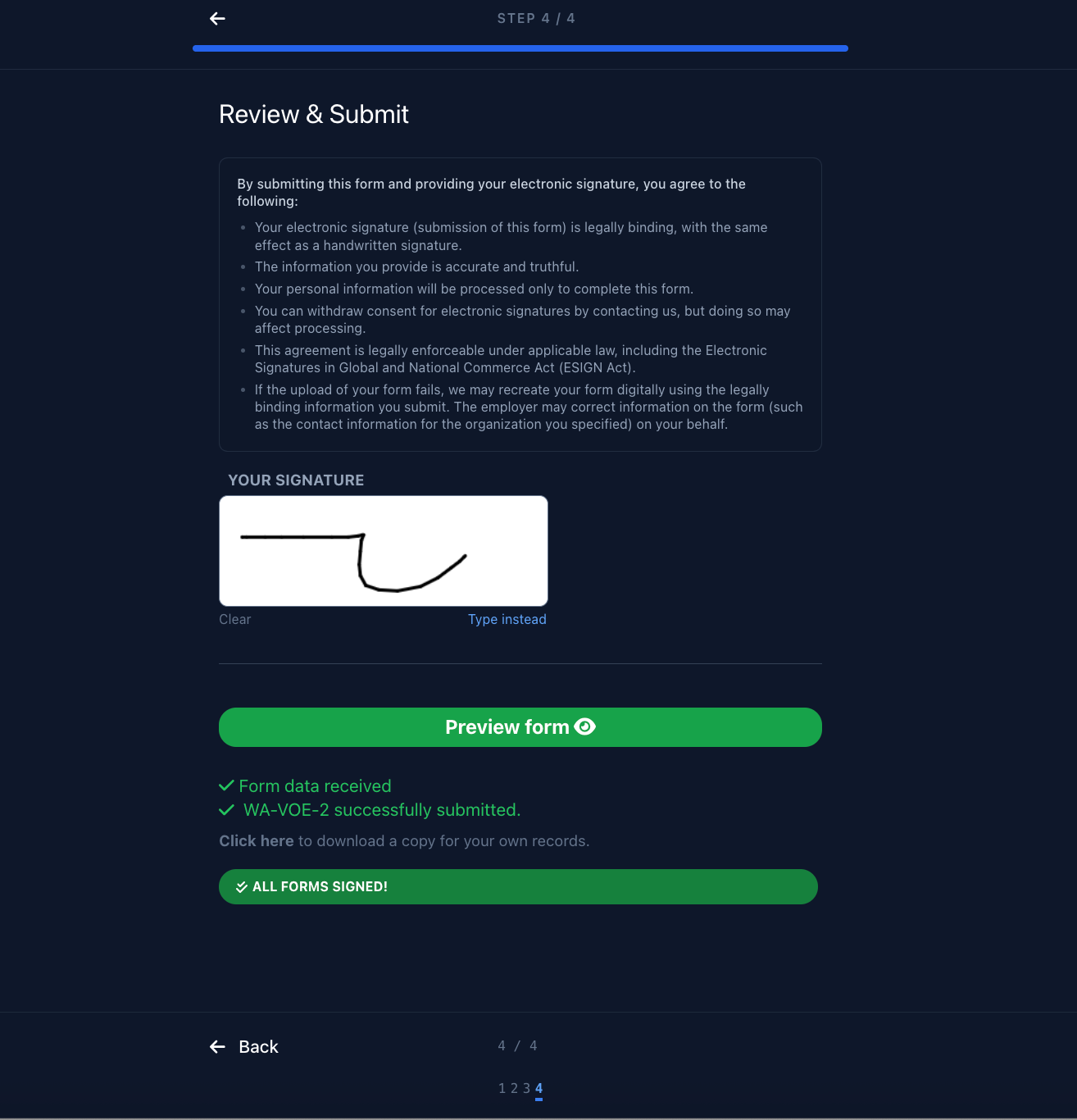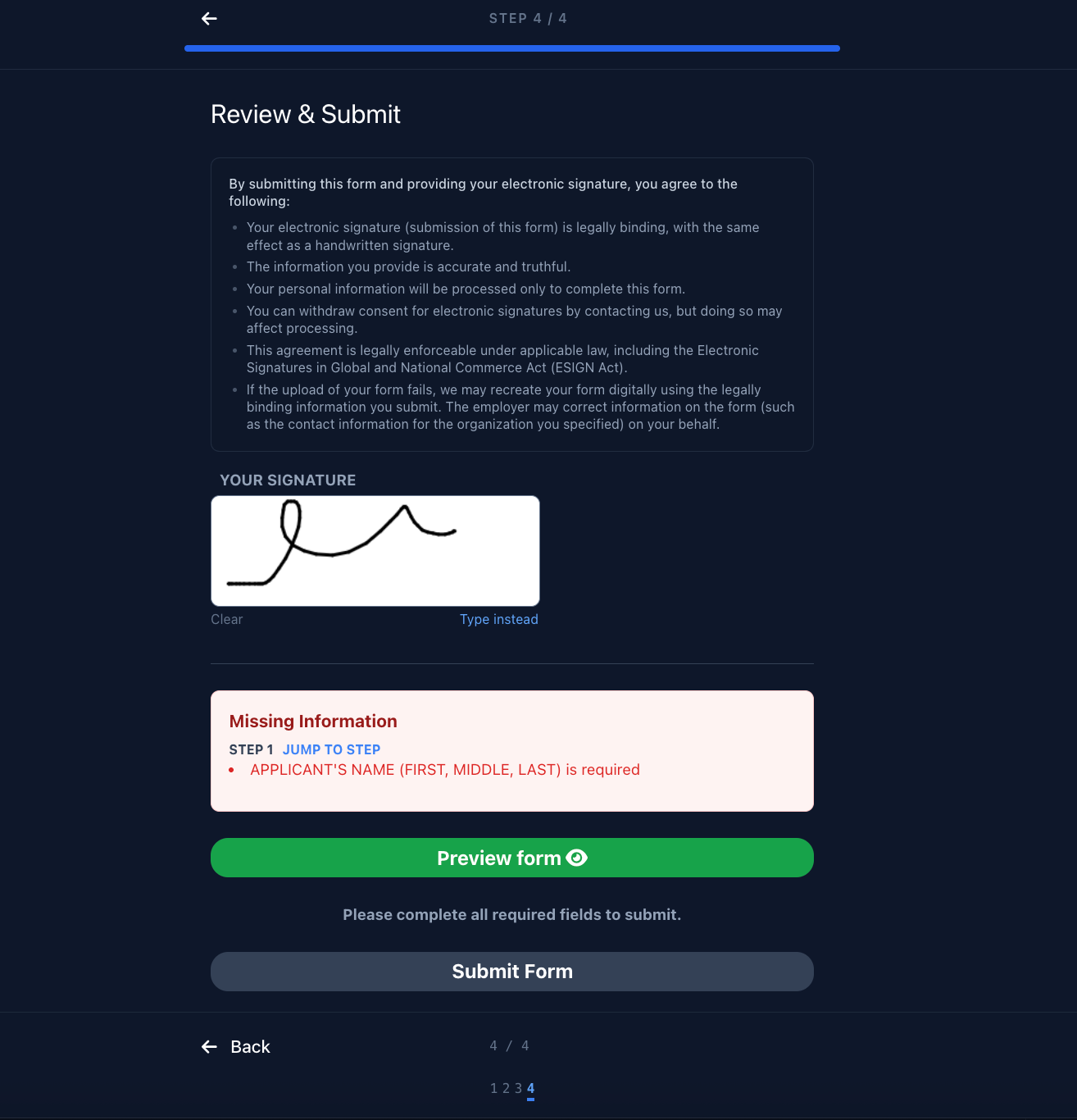 You must sign the form electronically before submitting. You can either use your mouse or type your name (select “type instead” on the bottom right of the signature box). If you are missing any information, you’ll see an alert in red at the bottom of the page. Go back to the section to add the required information before submitting the form.