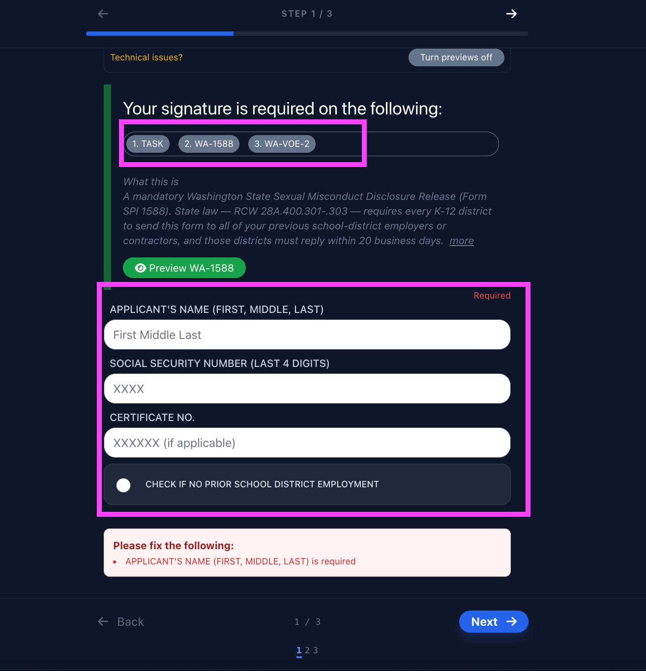Fill out the first section with the required personal information. Required fields will have a red “required” next to them, and turn green when complete.