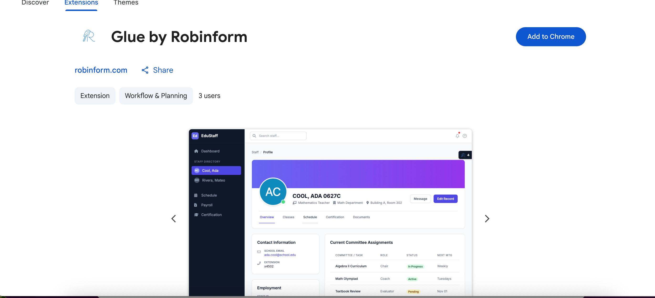 To set up the Chrome extension, first follow the link to download it from the Chrome store (it’s free for Robinform customers). *We have two extensions. Make sure you click on “Glue by Robinform”
