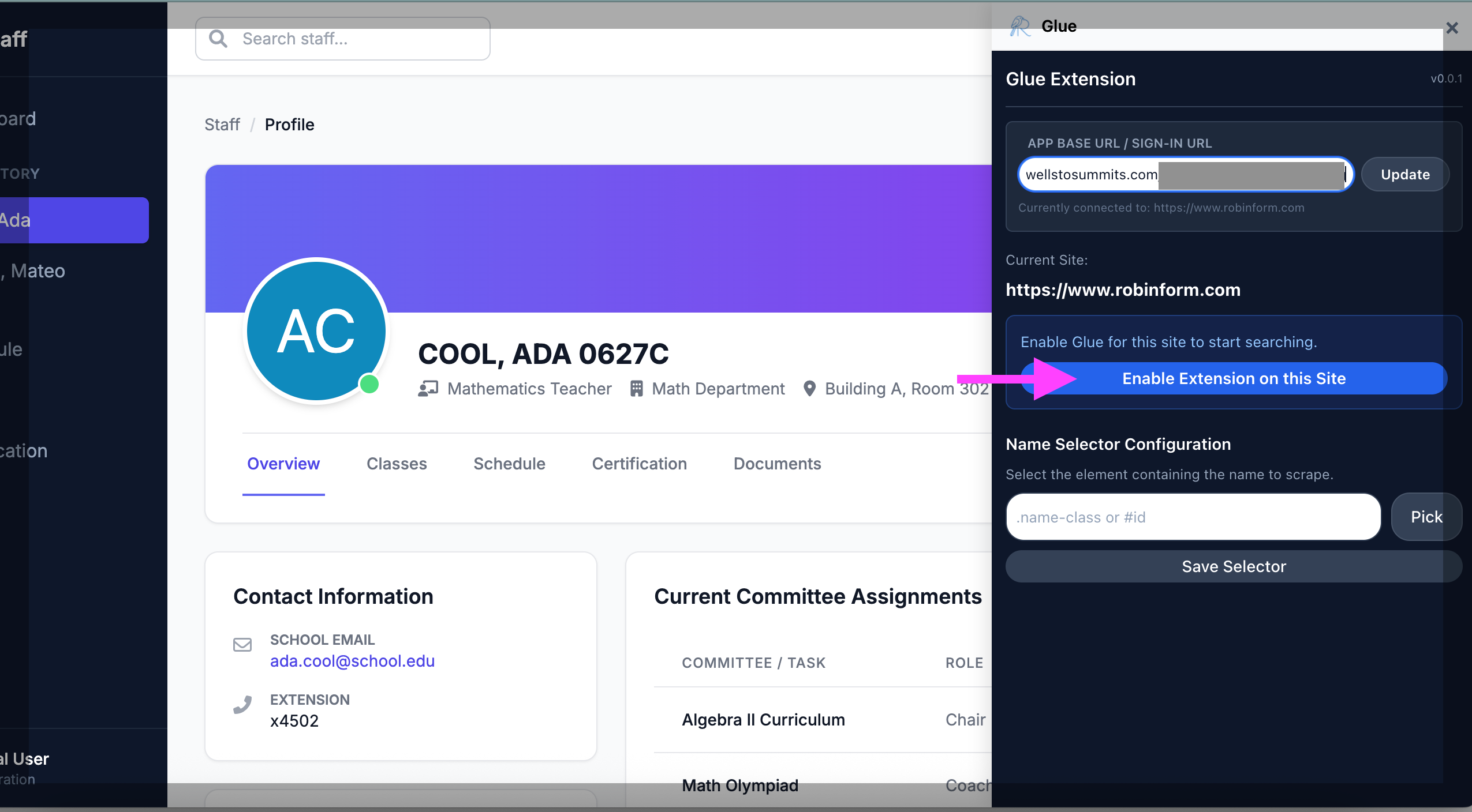 Next, open the extension on your HR platform. Copy/paste your organization’s Robinform URL from the dashboard. Then, you’ll be asked to grant permission for the extension to operate on the webpage: