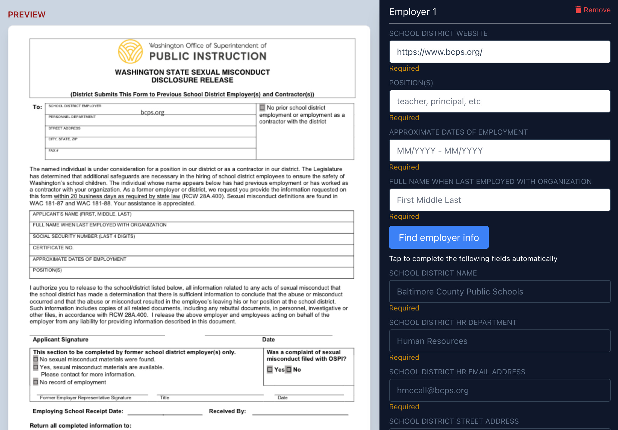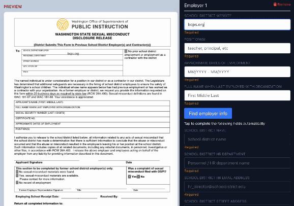 The second point of failure that we’ve found after launching Robinform is that many of the forms employees completed often contained missing or incorrect information. For example, if an employee could not find the correct email or fax number for the school district that previously employed them, they would enter N/A or “please call XXX-XXX-XXXX” in those fields, which interrupted the automatic process of sending an email to that school district with the form for signature.