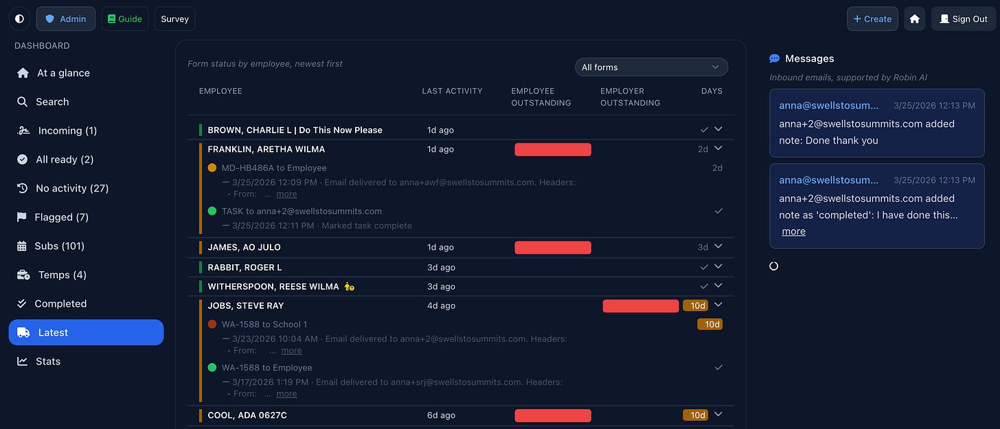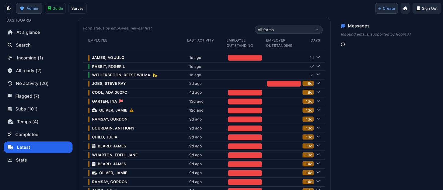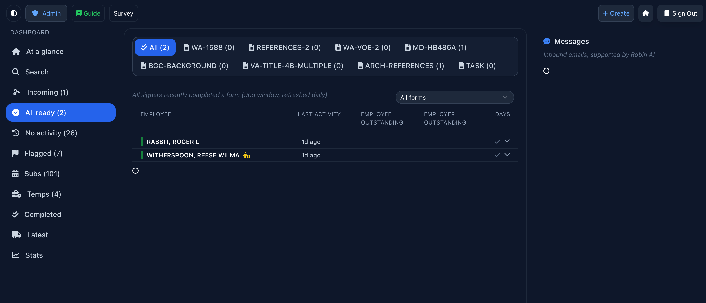 Once all forms are complete, the color next to the employee’s name will turn green, indicating there are no outstanding forms.