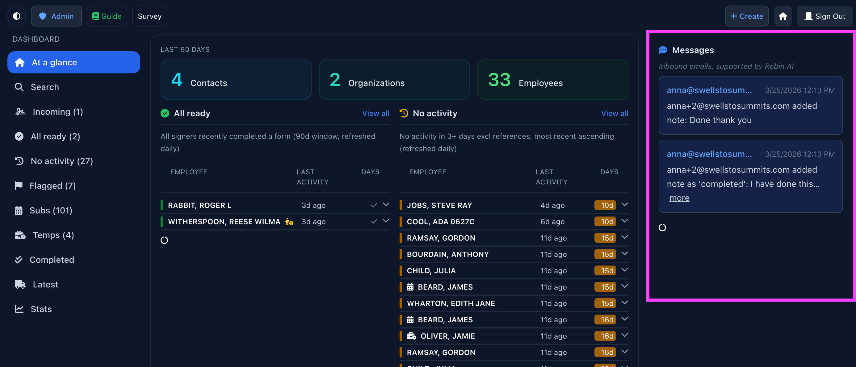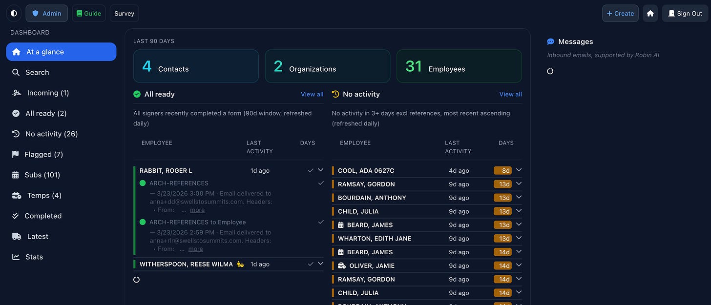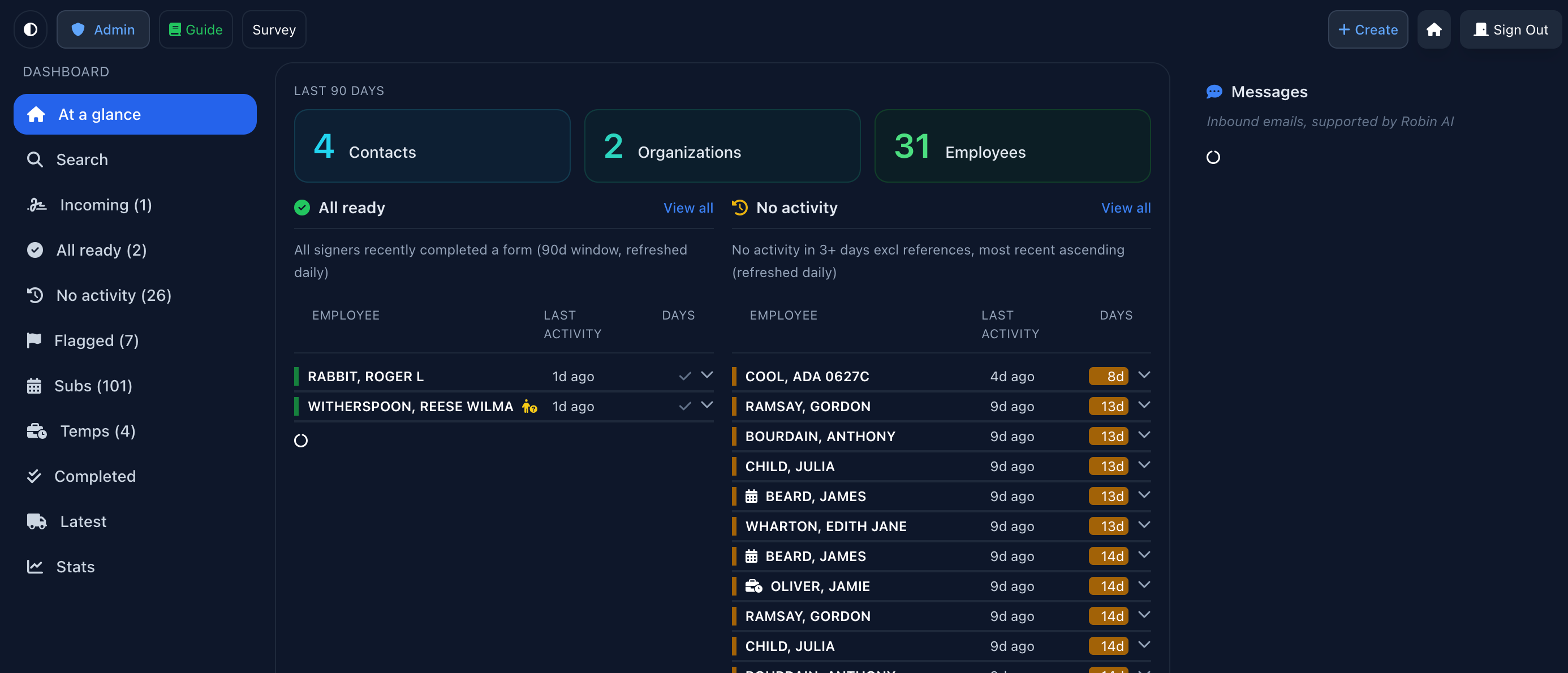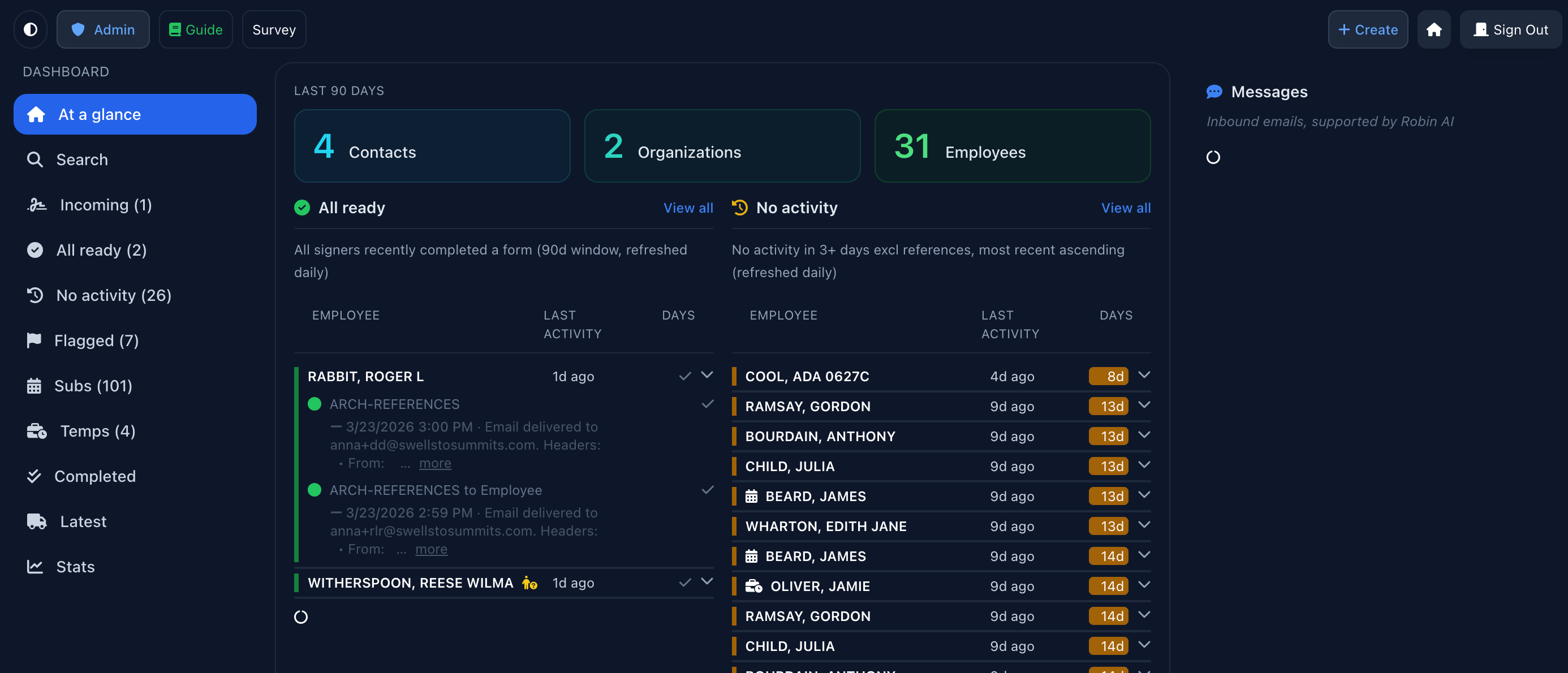 At the top of the page you will find several key stats including the number of employees (applicants/candidates) added, number of organizations you’ve sent forms to, and the number of contacts you’ve added. All information on the dashboard is for the past 90 days.