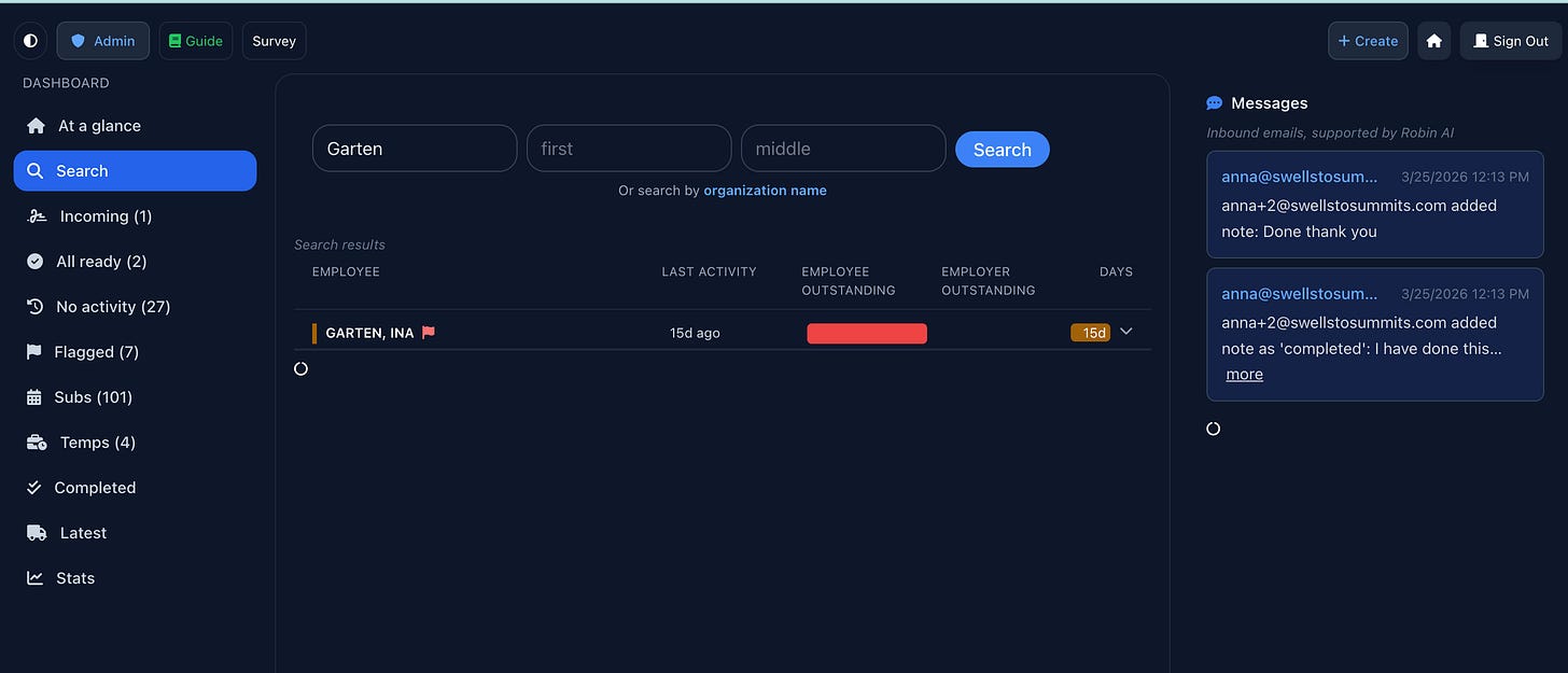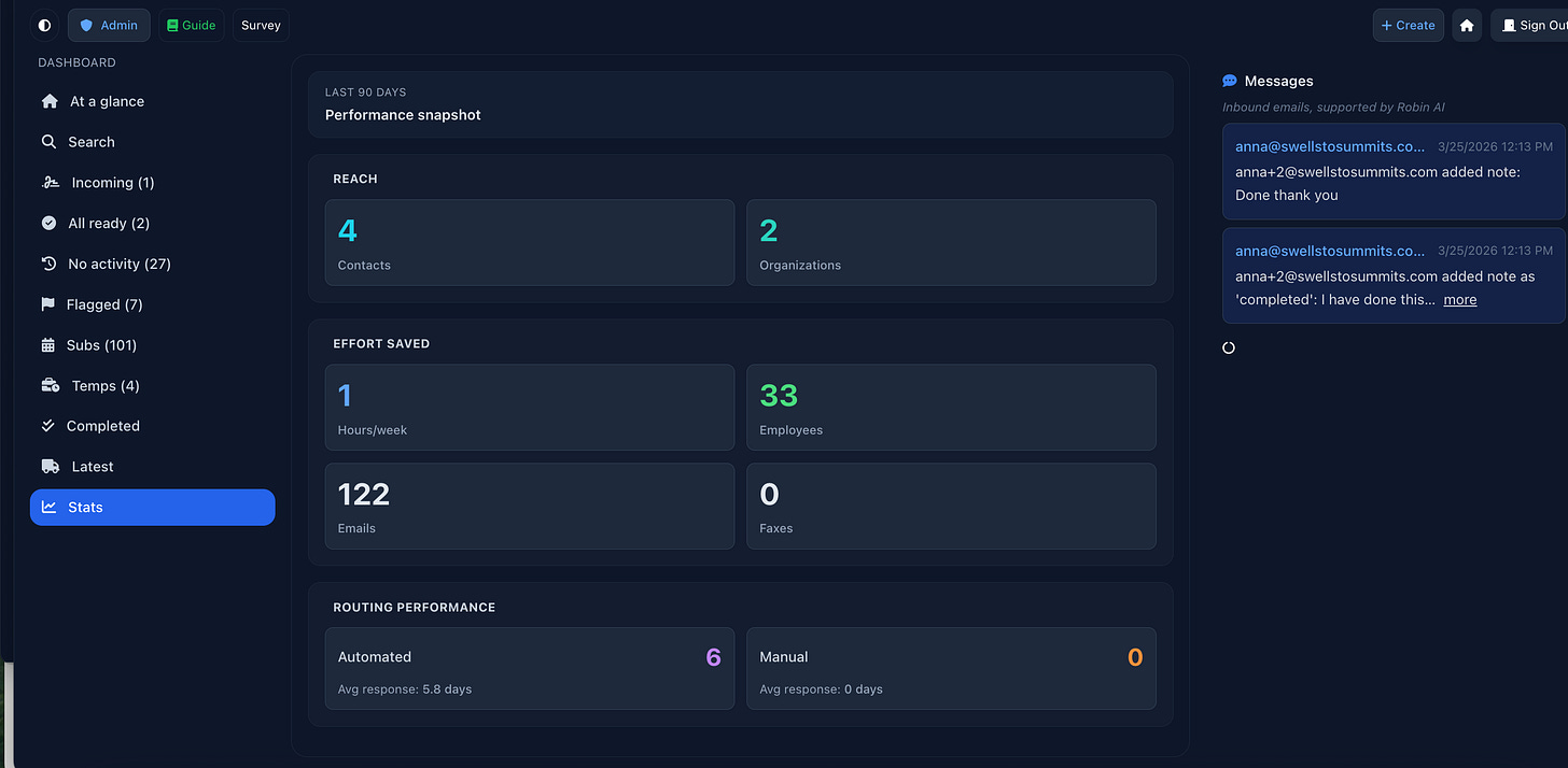 To drill down into your team’s workload, the stats tab shows key metrics including reach (how many orgs you’ve sent forms to); effort saved; and routing performance by Robinform (automated contacts vs. manual).
