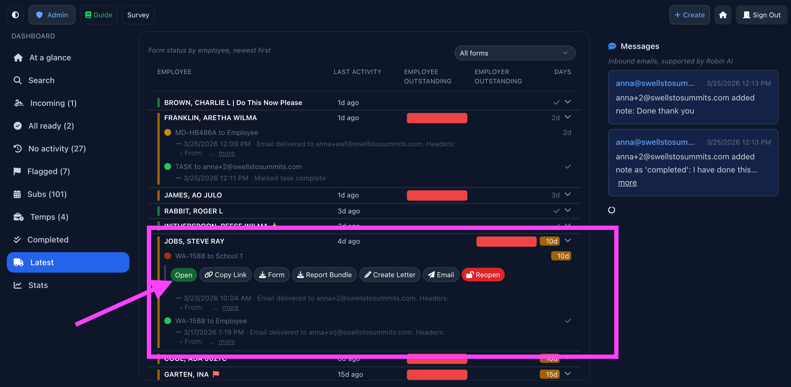If you click on a form for an employee, and select “Open”, you will go to the detailed form page to see the logs, edit contact information, schedule manual follow-ups, etc.