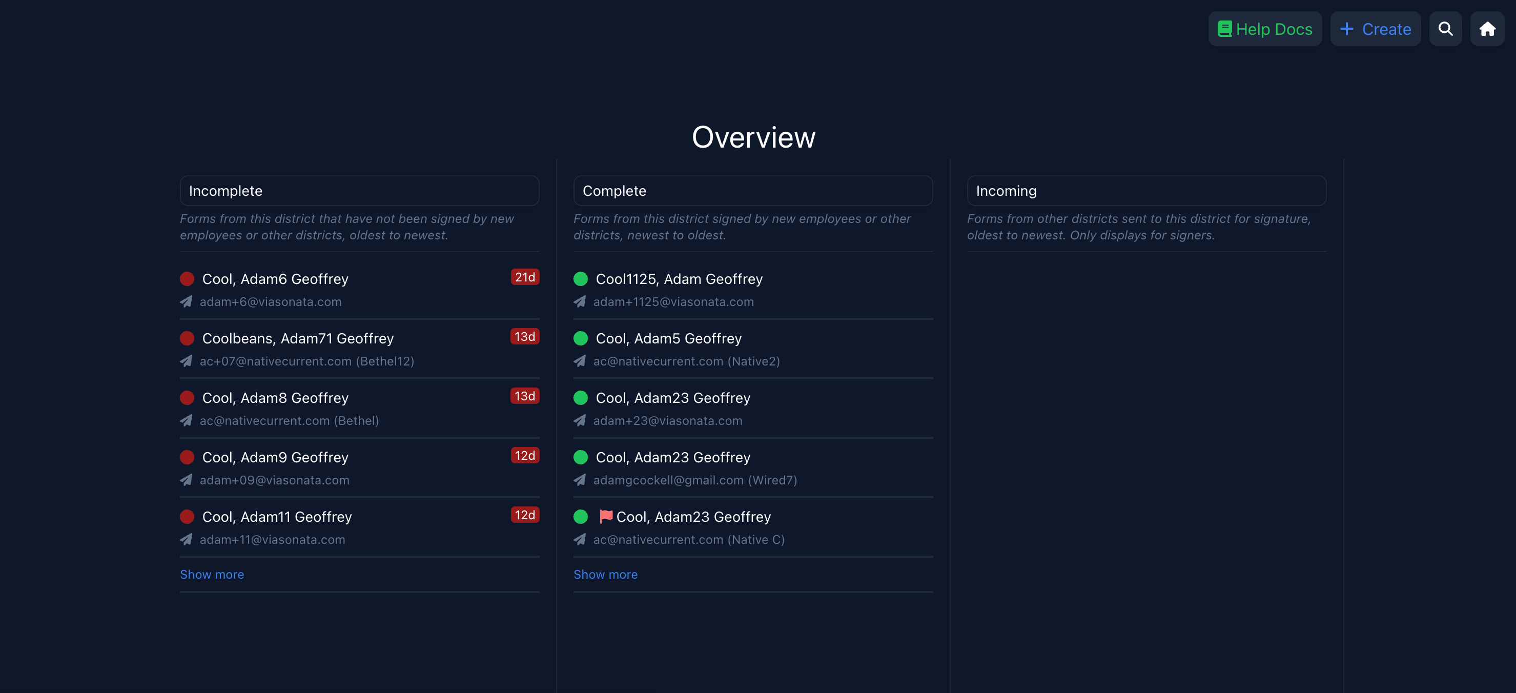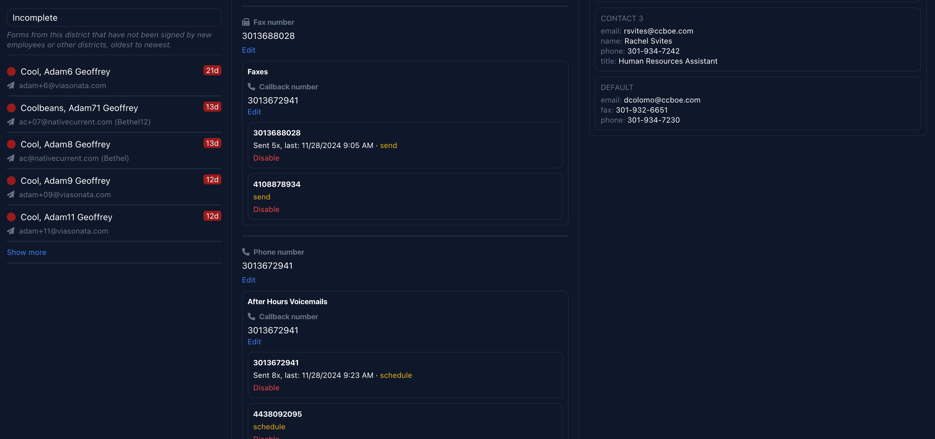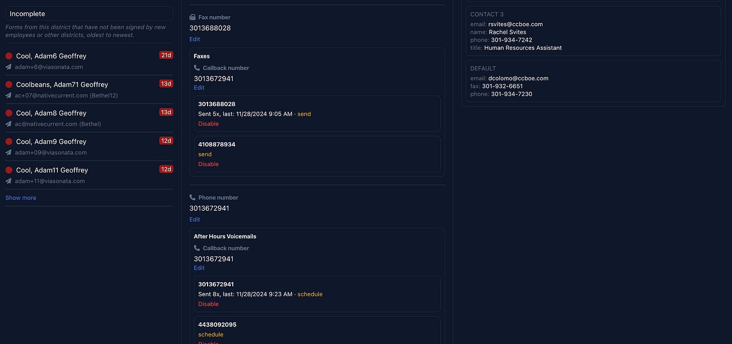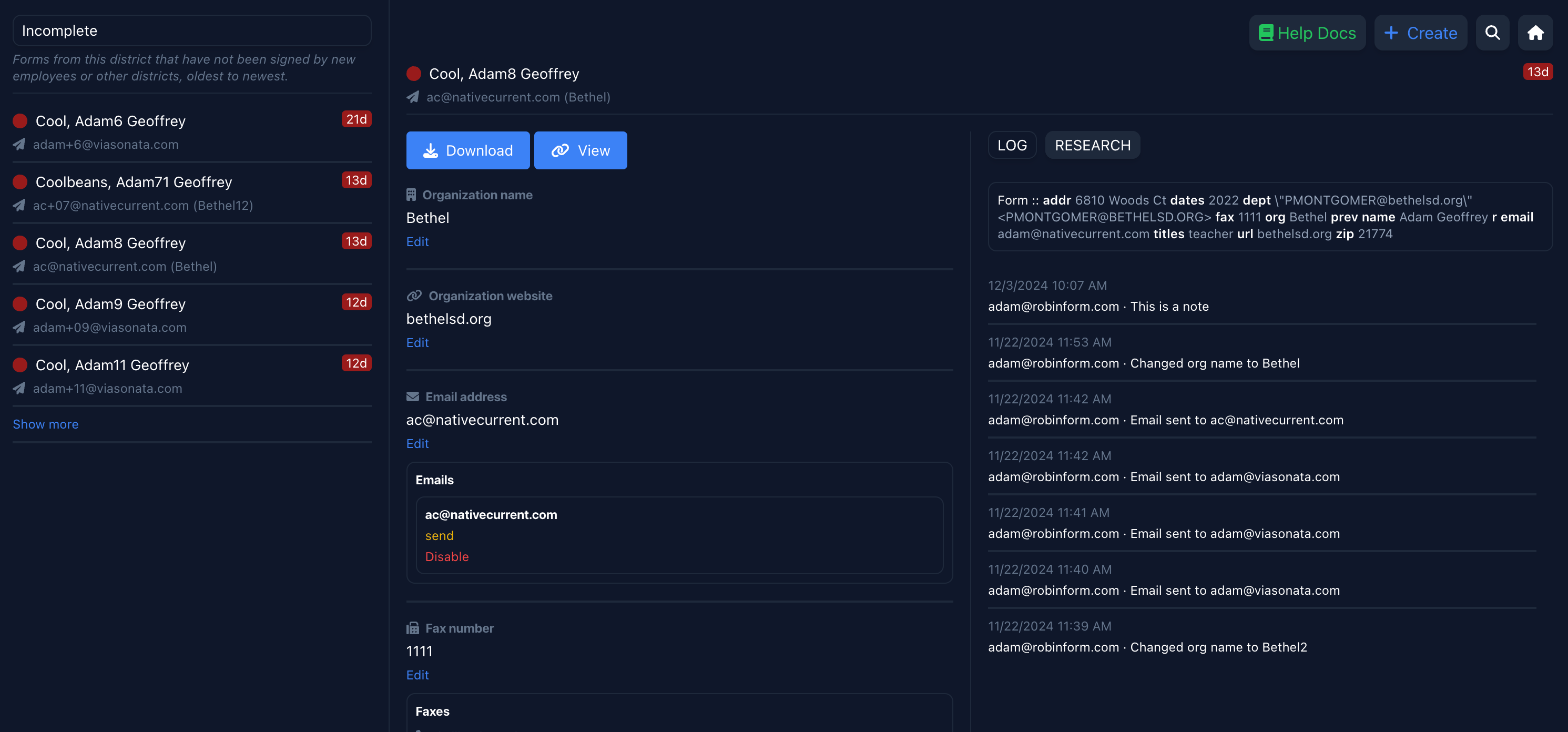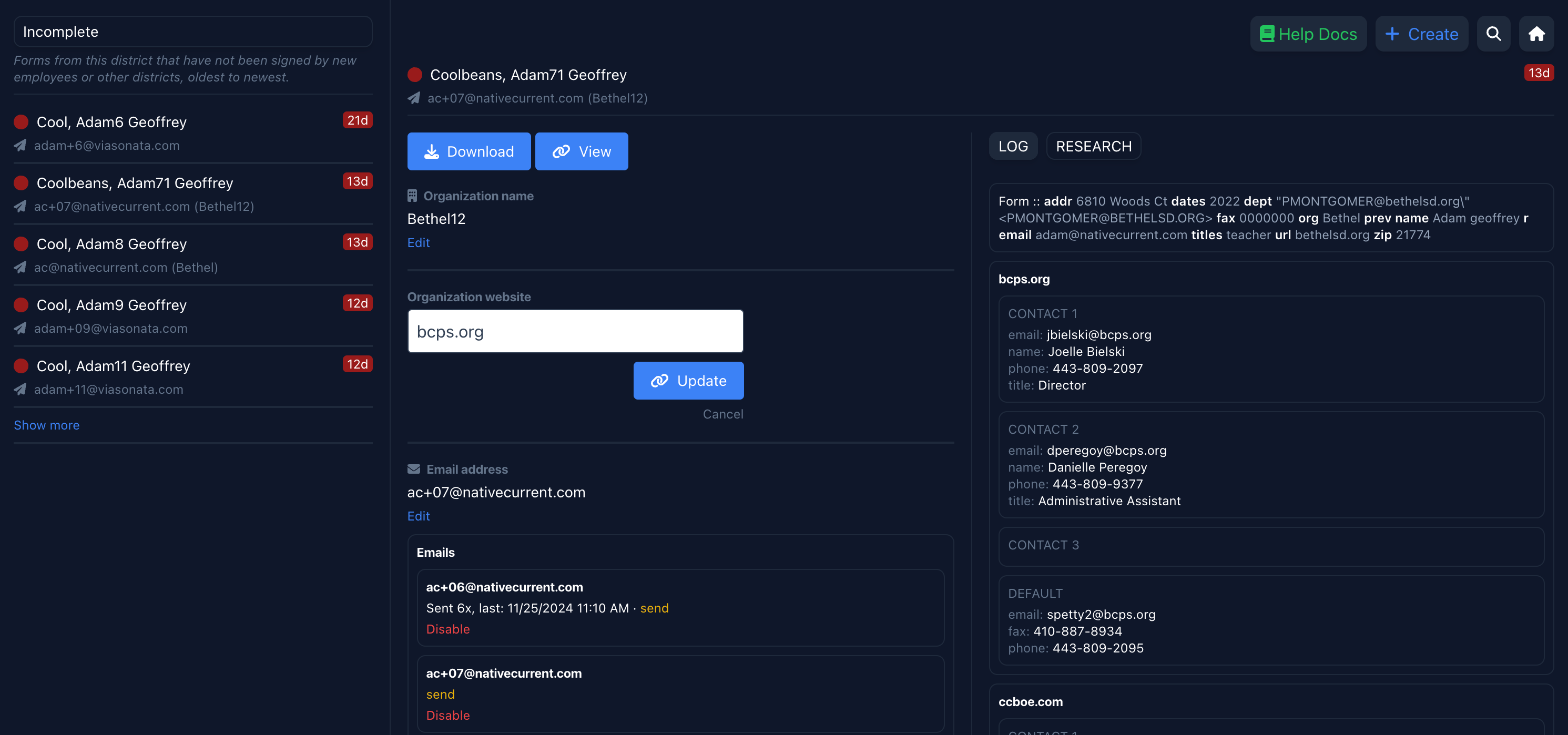 Forms for recipients by default require a website for the organization. When you update a website on the dashboard, the service automatically attempts to find the three best HR contacts (email, phone, fax for each) to reach out to. These will show up under the research tab next to the log.